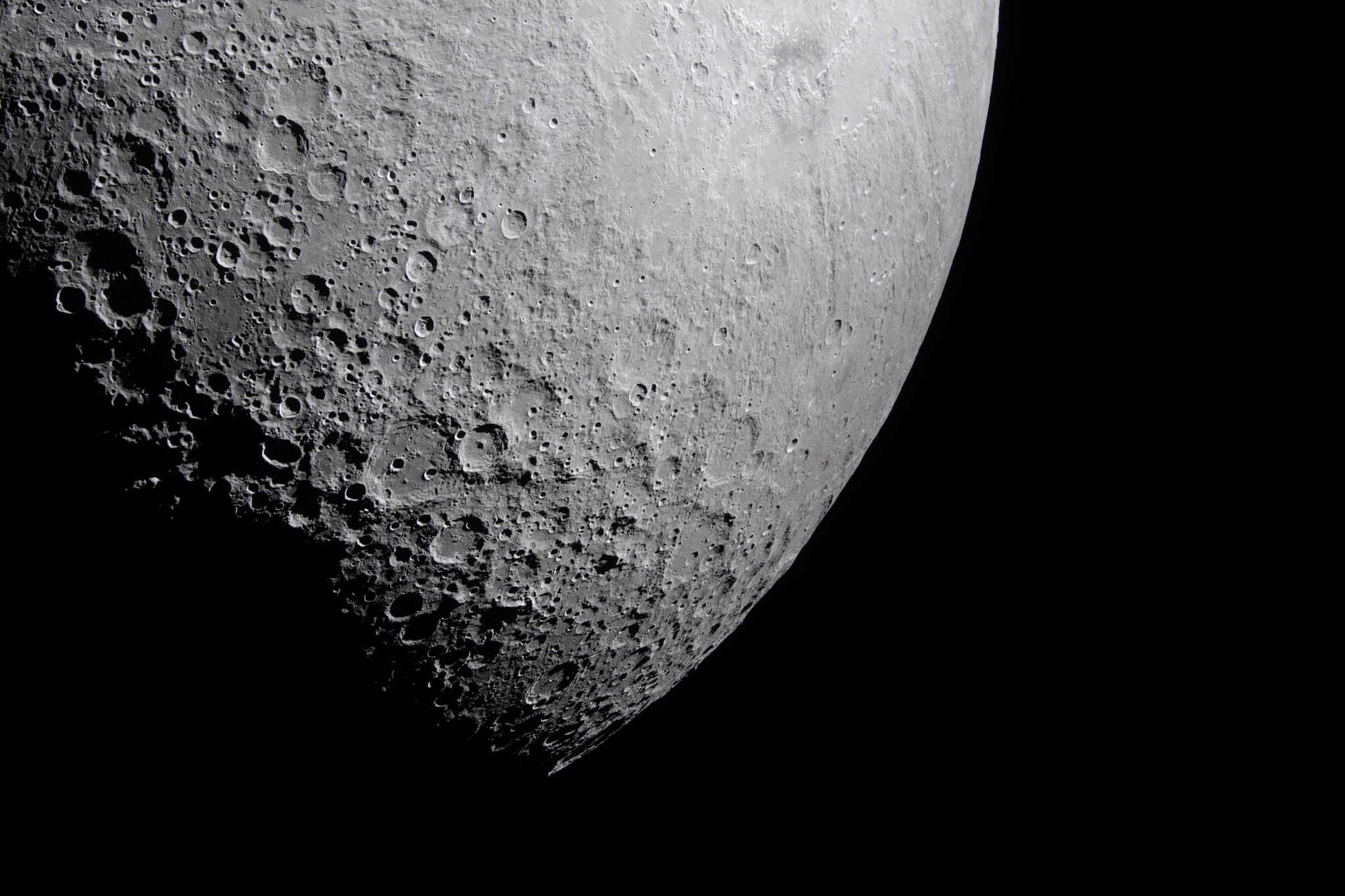 A section of Orientale Basin is visible along the upper right portion of the lunar disk, its structure subtly revealed under grazing illumination. This lighting enhances contrast across the cratered terrain, highlighting variations in surface features and providing insight into the Moon’s geologic history.