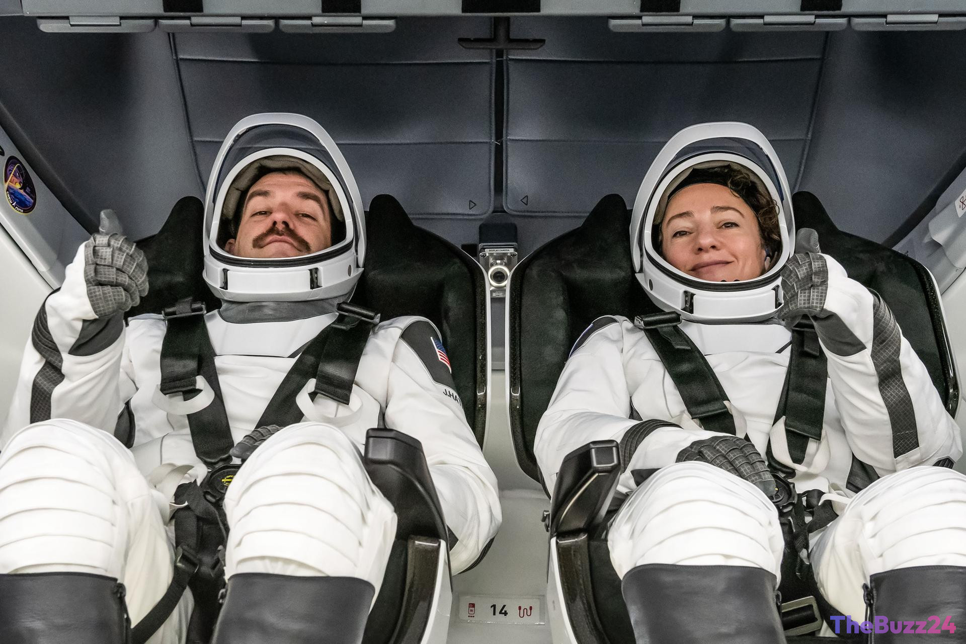 NASA astronauts (from left) Jack Hathaway and Jessica Meir are photographed on Jan. 12, 2026, in their pressure suits and inside the Dragon spacecraft during the Crew Equipment Interface Test at NASA’s Kennedy Space Center in Florida. The goal of the training is to rehearse launch day activities and get a close look at the spacecraft that will take them to the International Space Station.