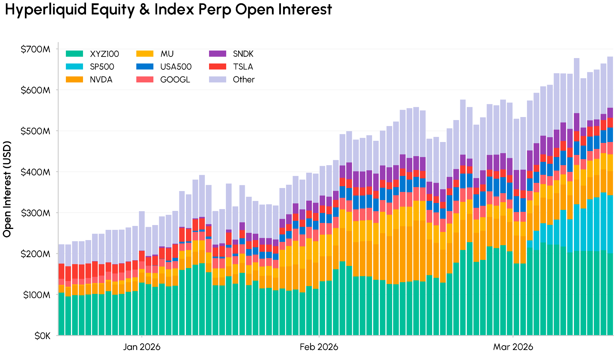 Within this segment, benchmarks on major stocks and indices have been the fastest growing as venues expand access. Kraken introduced perpetual futures contracts (perps) on xStocks in February, while Coinbase International rolled out stock perps, providing leveraged exposure to US stocks. Meanwhile, Hyperliquid’s largest HIP-3 deployer trade[XYZ] launched the first official S&P 500 perpetual contract in partnership with S&P Dow Jones Indices, adding to an array of markets providing exposure to global equities.
